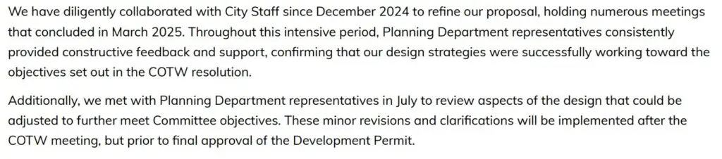 We are presenting a comparison of the two letters to reflect that in the first letter we see that OEZA’s (the developer) general lack of professionalism and high level of disrespect for the City process and staff. Our reading is that it was only later, when the developer realised this might negatively impact the City’s decision making, that OEZA tried to change the tone in the hope of a more favourable response.